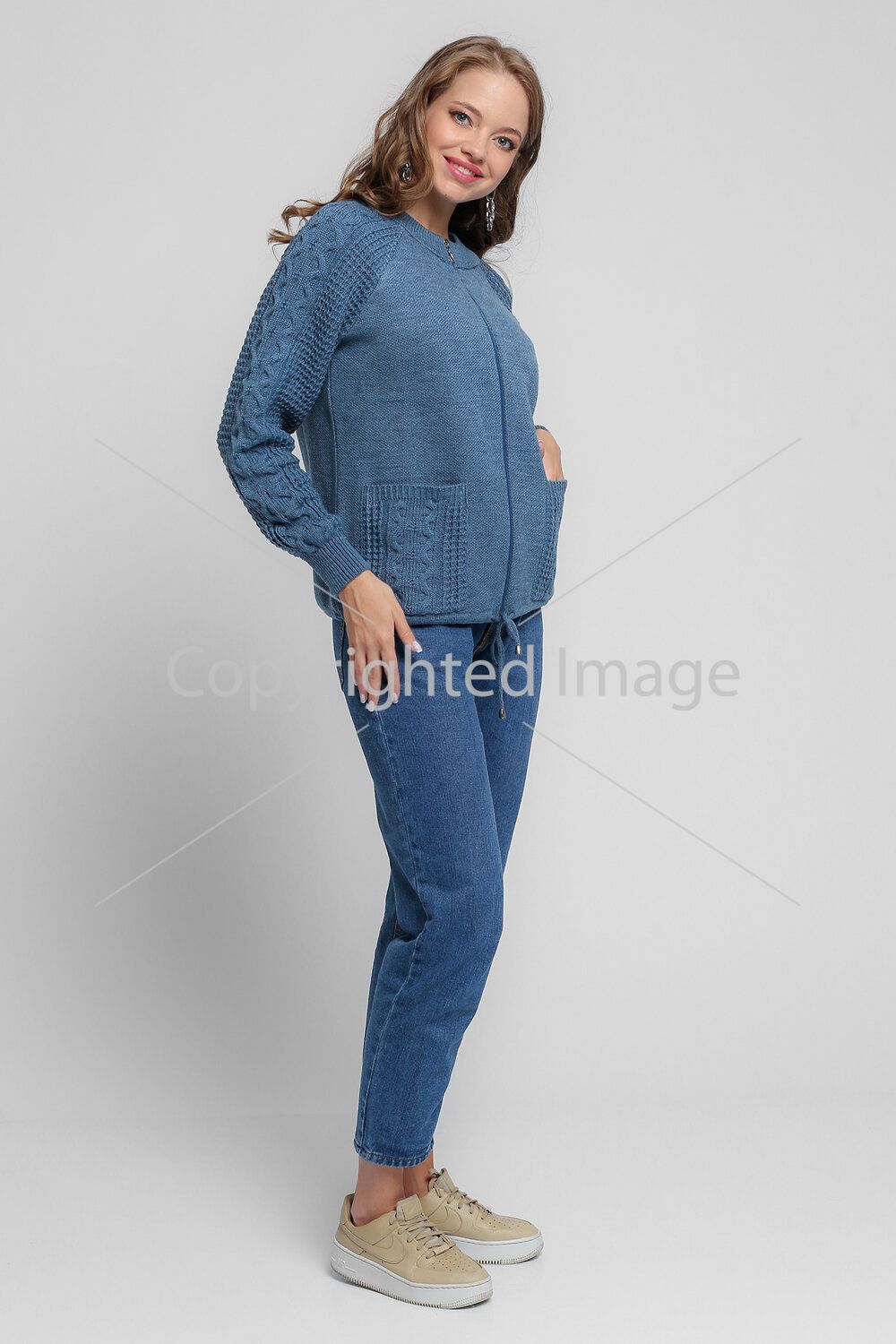 Women's knitted jacket with a loose silhouette in a sporty style. Zip-up jacket. Long raglan sleeve with elastic cuff. Stand-up collar. Two patch pockets. A lace is laid at the bottom of the product. The sleeves and pockets are made of openwork knitting with an Irish "arana" pattern.